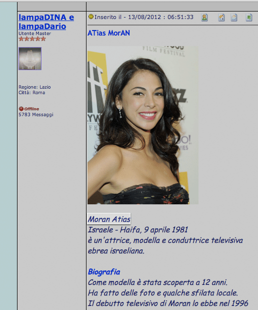 MOran ATias attrice, modella e conduttrice televisiva israeliana Nasce a Haifa il 9 aprile 1981 da genitori marocchini di religione ebraica. Come modella ? stata scoperta a 12 anni. Ha fatto delle foto e qualche sfilata locale. Il debutto televisivo di Moran lo ebbe nel 1996 nel programma israeliano per ragazzi Out of Focus. All'et? di 17 anni si trasferisce in Germania dove rimane per sette mesi, iniziando la carriera di modella internazionale. Dopo aver partecipato ai concorsi Miss Globe International e Top Model of the World, che ha vinto, giunge in Italia - dove sfila subito per Gianni Versace, Roberto Cavalli, D&G, BBG jeweleries, Verde Veronica, John Richmond e altri - posa per alcune cover di giornali di moda e femminili, e partecipa a diversi programmi televisivi come valletta: Carramba che fortuna (2000), in onda su Rai Uno, Superconvenscion (2000-2001), in onda su Rai 2, Italiani (2001), in onda su Canale 5, Matricole & Meteore (2003), in onda su Italia 1, I raccomandati (2003-2004), in onda su Rai Uno e il Natalino Balasso Show su Italia 1 nel 2004. Come presentatrice ha invece condotto in televisione la versione israeliana di Affari tuoi e in radio Shaker su RTL 102.5. Nella sua carriera cinematografica ha avuto parti in film americani, israeliani e italiani: tra questi ultimi, Gas (2005) di Luciano Melchionna, Le rose del deserto (2006) di Mario Monicelli, La terza madre (2007) di Dario Argento e Oggi sposi (2009) di Luca Lucini. Tra il 2008 e il 2009 appare nella serie televisiva americana Crash, e nello stesso anno in quella italiana nella miniserie tv Il bene e il male. Compare anche in una puntata della sesta stagione di CSI: NY dal titolo "Suicidio Apparente" e nella 21 puntata della nona stagione di CSI: Miami. Parla perfettamente ebraico, inglese, italiano e spagnolo