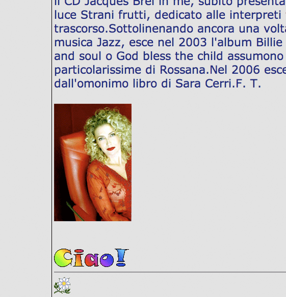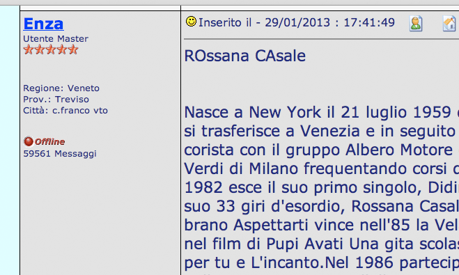 ROssana CAsale cantante italiana Figlia del fotografo Giac Casale, inizia la sua carriera negli anni '70 come corista per Riccardo Cocciante, Mina e soprattutto nei concerti dal vivo per Mia Martini e successivamente per la sorella Loredana Bert?. Compare anche come cantante in molte produzioni di musica dance (Klein & MBO, Kano, N.O.I.A., Mike Francis). Il primo singolo a suo nome, scritto da lei con Alberto Fortis, esce nel 1982 e si intitola Didin. Nel 1984 esce il suo primo album Rossana casale, prodotto dalla Premiata Forneria Marconi. Nel 1983 recita nel film di Pupi Avati, Una gita scolastica, e partecipa alla colonna sonora con i brani L'incanto e A tu per tu. Nel 1986 ottiene un buon successo al Festival di Sanremo con Brividi, brano scritto da Maurizio Fabrizio, come pure la sua canzone di Sanremo dell'anno successivo, Destino. Del 1986 ? l'album La via dei Misteri. Nell'autunno del 1986 partecipa a "Premiatissima 86" che vince con la canzone "Nuova vita". Inizia a cantare jazz ed ottiene i suoi primi riconoscimenti all'Umbria Jazz. Partecipa a Sanremo altre tre volte: nel 1989 con A che servono gli dei (contenuto nell'album Incoerente Jazz), nel 1991 con Terra (contenuto nell'album Lo stato naturale, in cui vengono fuse sonorit? etniche e jazz), e nel 1993, quando arriva terza cantando in coppia con Grazia Di Michele Gli amori diversi (poi seguito dall'album Alba Argentina). Nel 1992 ? interprete, insieme con Bobby Solo, della colonna sonora di Eddy e la banda del sole luminoso, (USA) Film animato di Don Bluth, ( Tit.Orig:"Rock-a-doodle"). Nel 1994 esce Jazz in Me, primo lavoro completamente jazz. Nel 1995 debutta nella commedia musicale Un americano a Parigi al fianco di Raffaele Paganini, ottenendo un grande successo e molti riconoscimenti. Nel 1996 ? la volta di Nella notte un volo. Nel 1999 pubblica Jacques Brel in Me. Nel 2000 esce Strani frutti, nello stesso anno ? impegnata a teatro nelle commedia musicale A qualcuno piace caldo al fianco di Alessandro Gassman e Gianmarco Tognazzi, per la regia di Saverio Marconi. Nella stagione teatrale 2001/2002 ? protagonista della commedia musicale La piccola bottega degli orrori, accanto a Manuel Frattini, sempre diretta da Saverio Marconi. Nel 2002 partecipa come direttrice dell'"Accademia" al programma musicale di Italia 1 che cercava nuovi talenti canori, Operazione Trionfo. Confermando la sua passione per la musica jazz, nel 2003 pubblica Billie Holiday in Me. Anticipato dal brano Gioir d'amore, nel 2006 pubblica Circo immaginario, album ispirato dall'omonimo libro di Sara Cerri. Nel 2008 canta una canzone del cartone animato giapponese My Melody Sogni di Magia in onda su Italia 1 nell'autunno 2008. Il 21 giugno 2009 ? una delle protagoniste del concerto evento allo stadio San Siro di Milano in favore dei terremotati del Terremoto dell'Aquila del 2009. Per l'iniziativa benefica intitolata Amiche per l'Abruzzo, ideata da Laura Pausini, ha duettato con Mariella Nava e Andrea Mir? in Spalle al muro.