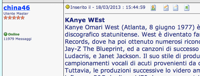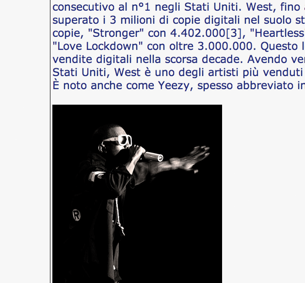 Kanye Omari West (Atlanta, 8 giugno 1977) ? un rapper, beatmaker, stilista e produttore discografico statunitense. West ? diventato famoso come produttore per la Roc-A-Fella Records, dove ha poi ottenuto numerosi riconoscimenti grazie al suo lavoro sull'album di Jay-Z The Blueprint, ed a canzoni di successo per molti artisti musicali tra cui Alicia Keys, Ludacris, e Janet Jackson. Il suo stile di produzione inizialmente usato prevedeva campionamenti vocali di acuti provenienti da canzoni soul incorporati con i suoi strumenti. Tuttavia, le produzioni successive lo videro ampliare la sua tavolozza musicale esprimendo influenze R&B degli anni '70, baroque pop, trip hop, arena rock, folk, alternativa, elettronica, synthpop, e musica classica. Ha pubblicato il suo primo album, The College Dropout, nel 2004; il secondo, Late Registration, nel 2005; il terzo, Graduation, nel 2007; il quarto, 808s & Heartbreak, nel 2008; il quinto, My Beautiful Dark Twisted Fantasy, ? stato pubblicato nel 2010; mentre il sesto ed ultimo album finora realizzato, Yeezus, nel 2013. Inoltre collabora insieme a Jay-Z per la realizzazione di Watch the Throne, pubblicato nel 2011. I suoi primi cinque album da solista, ognuno dei quali ha raggiunto il disco di platino negli Stati Uniti, furono premiati dalla critica e ricevettero numerosi premi, tra cui 11 Grammy Awards. Tutti gli album sono stati un successo commerciale, con My Beautiful Dark Twisted Fantasy che diventa il suo quarto album consecutivo al n?1 negli Stati Uniti. West, fino al luglio 2011, ha 5 canzoni che hanno superato i 3 milioni di copie digitali nel suolo statunitense: Gold Digger con 3.086.000 copie, Stronger con 4.402.000, Heartless con 3.742.000, ET con oltre 5.000.000 e Love Lockdown con oltre 3.000.000. Questo lo porta ad essere il terzo artista con pi? vendite digitali nella scorsa decade. Avendo venduto pi? di 30 milioni di brani digitali negli Stati Uniti, West ? uno degli artisti pi? venduti digitalmente di tutti i tempi. ? noto anche come Yeezy, spesso abbreviato in Ye.