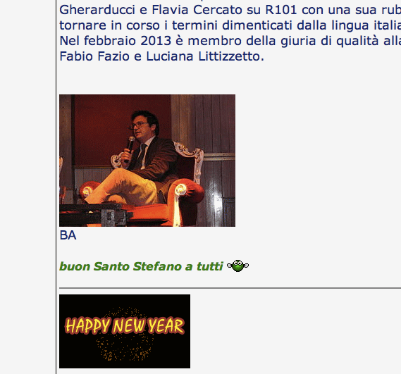 Da Settembre 2012 è presente nella trasmissione "Stile Libero" condotta da Marco Santin Giorgio Gherarducci e Flavia Cercato su R101 con una sua rubrica dal titolo "Parole Parole" dove si occupa di far tornare in corso i termini dimenticati dalla lingua italiana