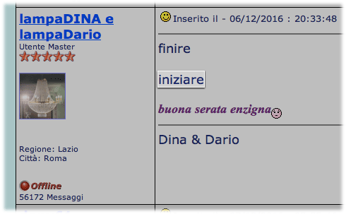 Inserito il - 20/12/2016 : 20:06:35  Mostra Profilo  Visita l'Homepage di lampaDINA e lampaDario Invia a lampaDINA e lampaDario un Messaggio Privato  Rispondi Quotando