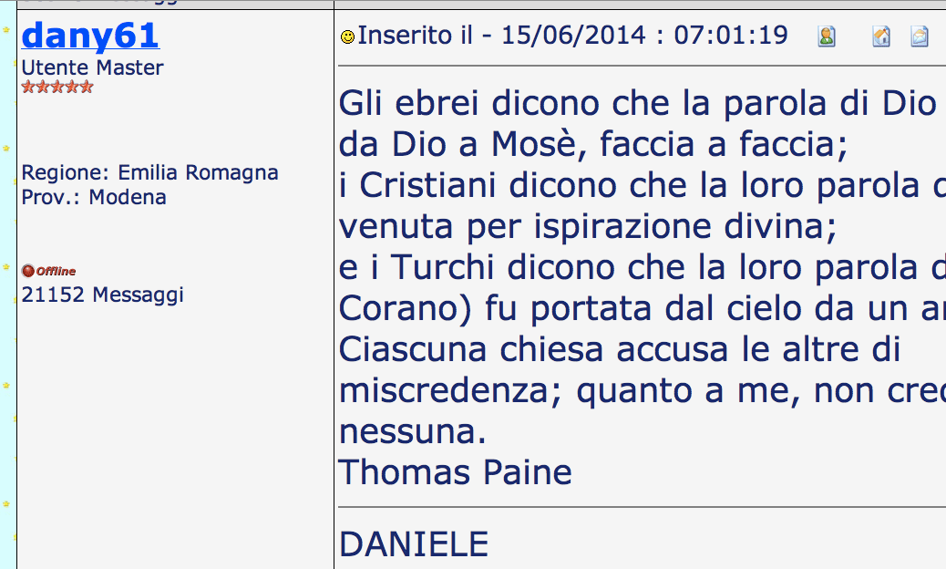 Gli ebrei dicono che la parola di Dio fu data da Dio a Mosè, faccia a faccia; i Cristiani dicono che la loro parola di Dio è venuta per ispirazione divina; e i Turchi dicono che la loro parola di Dio (il Corano) fu portata dal cielo da un angelo. Ciascuna chiesa accusa le altre di miscredenza; quanto a me, non credo a nessuna. Thomas Paine
