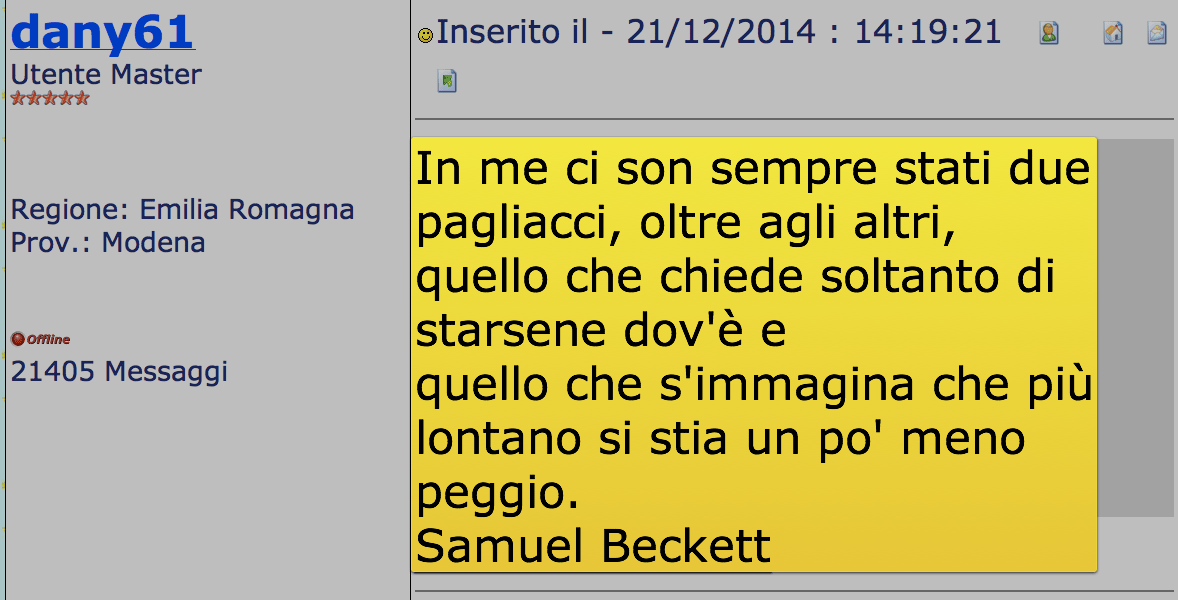 In me ci son sempre stati due pagliacci, oltre agli altri, quello che chiede soltanto di starsene dov'è e quello che s'immagina che più lontano si stia un po' meno peggio. Samuel Beckett |