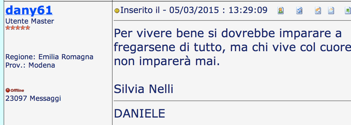 "Per vivere bene si dovrebbe imparare a fregarsene di tutto, ma chi vive col cuore non imparerà mai." [S. Nelli] |