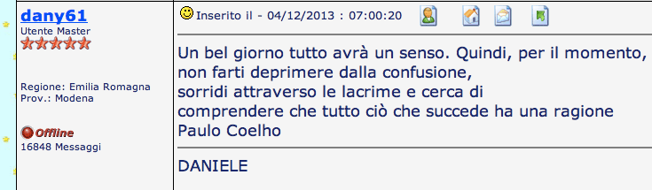 Guai a noi se non avessimo qualcosa di cui rimproverarci...l'autocritica è il migliore esempio di umiltà. (Rossella Di Venti ) |
