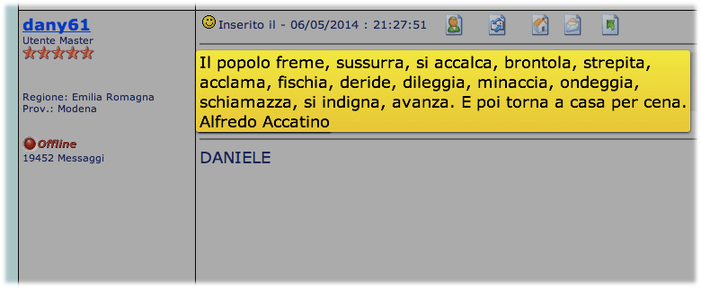 Il popolo freme, sussurra, si accalca, brontola, strepita, acclama, fischia, deride, dileggia, minaccia, ondeggia, schiamazza, si indigna, avanza. E poi torna a casa per cena. Alfredo Accatino