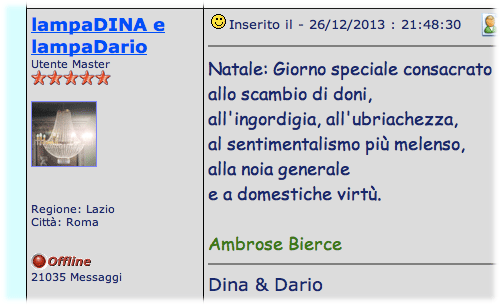 Natale. Giorno speciale, consacrato allo scambio di doni, all'ingordigia, all'ubriachezza, al sentimentalismo più melenso, alla noia generale e a domestiche virtù. Ambrose Bierce |