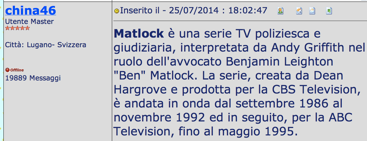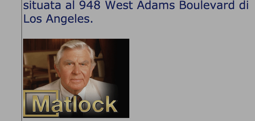 Matlock è un americano dramma legale televisione, interpretato da Andy Griffith nel ruolo del titolo di penale-difesa avvocato Ben Matlock . Lo spettacolo, prodotto da The Fred Silverman Company, Dean Hargrove Productions, Viacom Productions (la società CBS Television Studios ), e Paramount Television (solo season , originariamente in onda dal 23 settembre 1986, alle 8 maggio 1992, sulla NBC ; e dal 5 novembre 1992 fino al 7 Maggio 1995, su ABC .