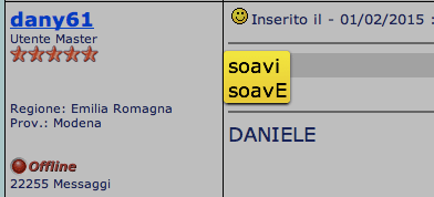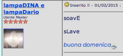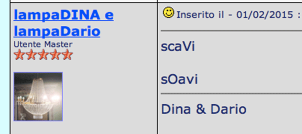 Inserito il - 15/02/2015 : 15:12:48  Mostra Profilo  Visita l'Homepage di lampaDINA e lampaDario Invia a lampaDINA e lampaDario un Messaggio Privato  Rispondi Quotando