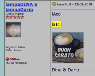 Inserito il - 08/09/2018 : 11:08:06  Mostra Profilo  Visita l'Homepage di lampaDINA e lampaDario Invia a lampaDINA e lampaDario un Messaggio Privato  Rispondi Quotando