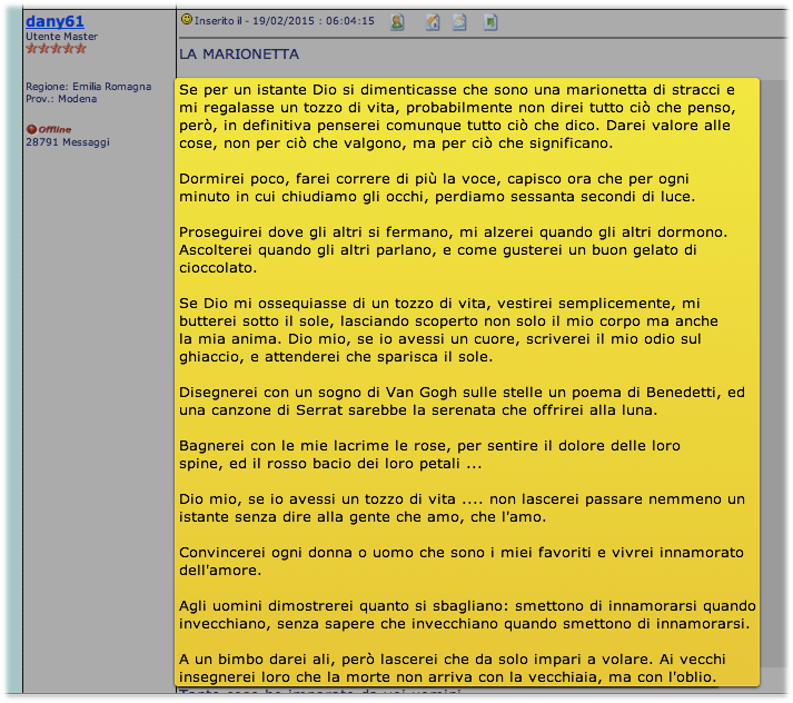 Ci sono due tipi di libro, quelli da consultare e quelli da leggere. I primi (il prototipo è l’elenco telefonico, ma si arriva sino ai dizionari e alle enciclopedie) occupano molto posto in casa, sono difficili da manovrare, e sono costosi. Essi potranno essere sostituiti da dischi multimediali, così si libererà spazio, in casa e nelle biblioteche pubbliche, per i libri da leggere (che vanno dalla Divina Commedia all’ultimo romanzo giallo). I libri da leggere non potranno essere sostituiti da alcun aggeggio elettronico. Sono fatti per essere presi in mano, anche a letto, anche in barca, anche là dove non ci sono spine elettriche, anche dove e quando qualsiasi batteria si è scaricata, possono essere sottolineati, sopportano orecchie e segnalibri, possono essere lasciati cadere per terra o abbandonati aperti sul petto o sulle ginocchia quando ci prende il sonno, stanno in tasca, si sciupano, assumono una fisionomia individuale a seconda dell’intensità e regolarità delle nostre letture, ci ricordano (se ci appaiono troppo freschi e intonsi) che non li abbiamo ancora letti, si leggono tenendo la testa come vogliamo noi, senza imporci la lettura fissa e tesa dello schermo di un computer, amichevolissimo in tutto salvo che per la cervicale (Umberto Eco) |